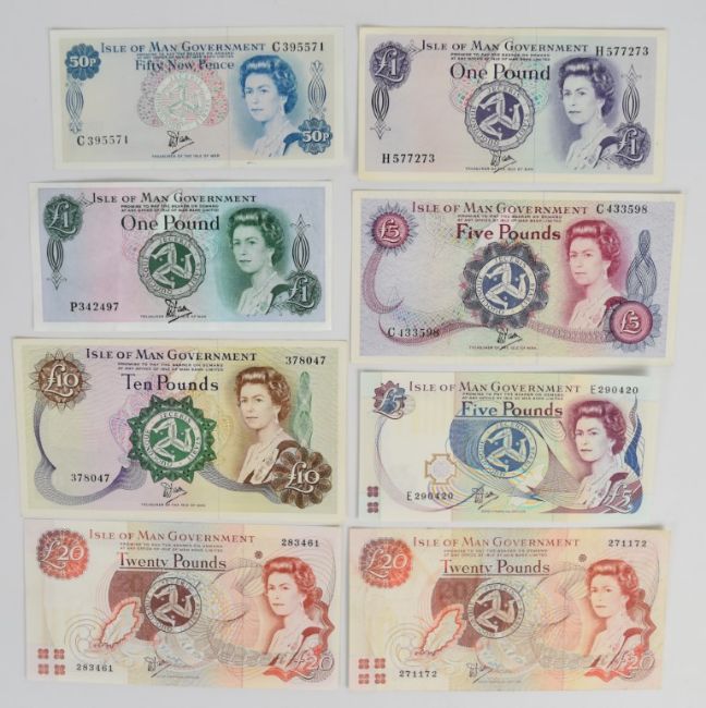 Eight Isle of Man W. Dawson banknotes including high grade 'A' prefix £10