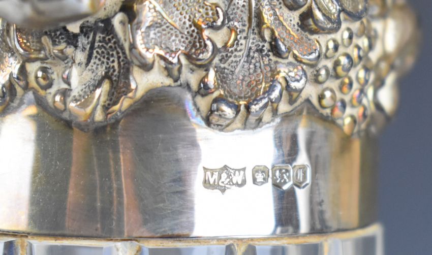 Mappin & Webb Elizabeth II hallmarked silver mounted claret jug in the Victorian style, with cut glass body and cast decoration to the silver handle and mount, Sheffield 1973, height 30cm