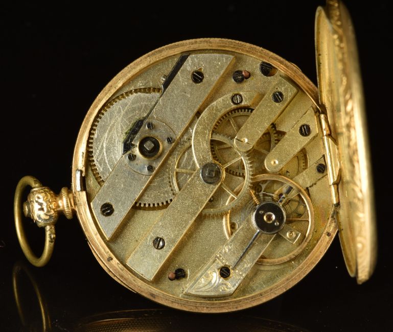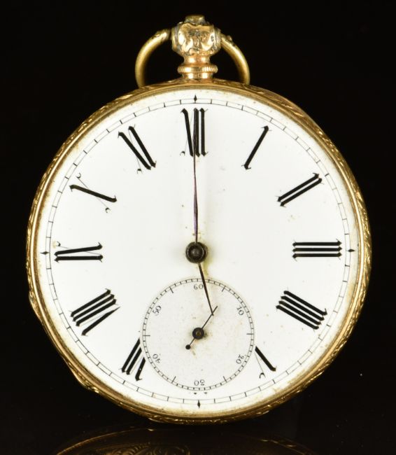 Unnamed 18ct gold open faced pocket watch with inset subsidiary seconds dial, blued hands, black Roman numerals, white enamel dial and unsigned movement, case diameter 44mm, serial number 34374, 51.4g.