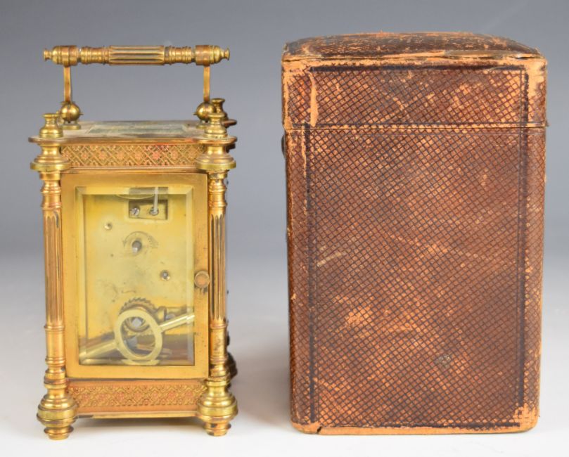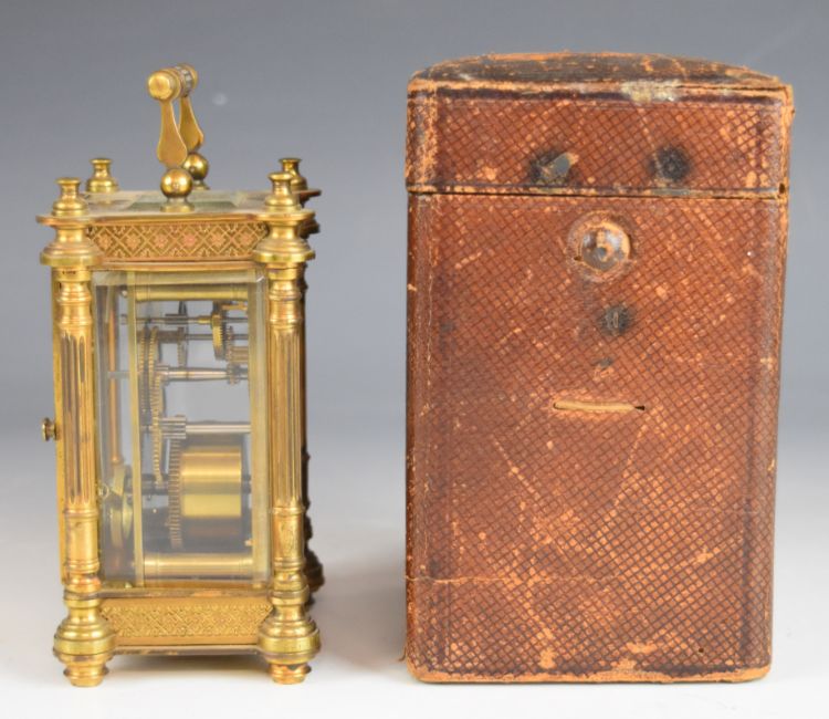 Late 19th or early 20th century gilt cased carriage clock with bevelled glass and fretwork decoration, marked to movement R&Co. Paris, likely for Richard & Cie. height including handle 15cm, in original leather fitted case