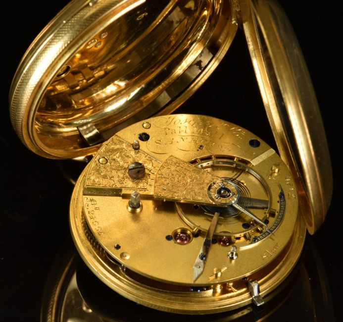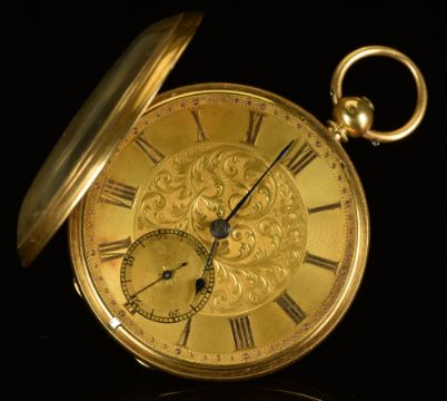 Joesph & Co 18ct gold open faced pocket watch with subsidiary seconds dial, blued hands, gold Roman numerals, engraved gold dial and case and signed movement, case diameter 54mm, serial number 24004, 135.6g, in fitted S Smith & Son Ltd box.