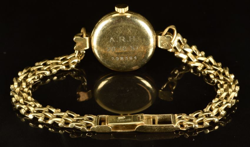 Unnamed 9ct gold ladies wristwatch with gold hands and hour markers, silver dial and unsigned calibre 555 movement, on 9ct gold bracelet, case diameter 20mm, 18.2g.