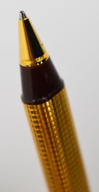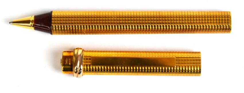 Must de Cartier Stylo Bille ballpoint pen with engraved gold plated body and cap and tri-colour twist decoration.