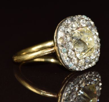 Victorian gold ring set with a central yellow diamond measuring approximately 1ct surrounded by smaller old cut diamonds, size D, 4.7g