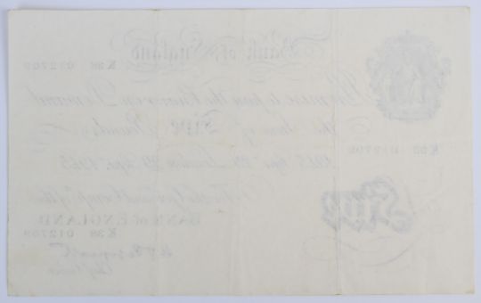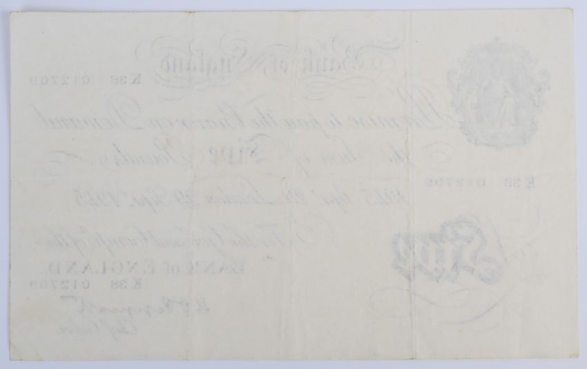 Bank of England 1945 K.O. Peppiatt white £5 banknote, London, 29th Sept. 1945