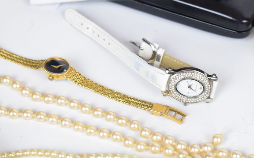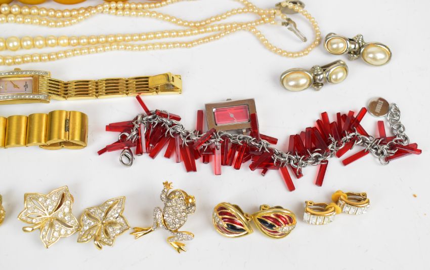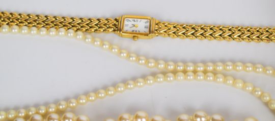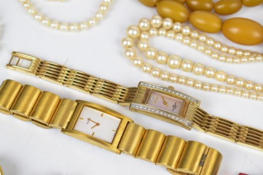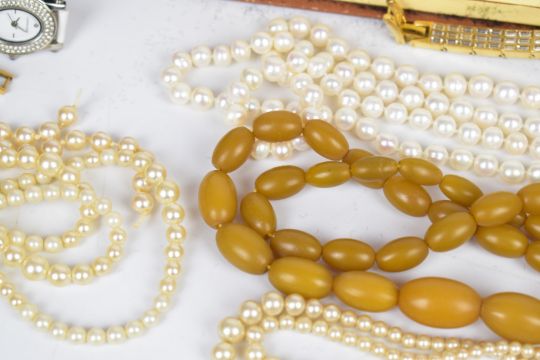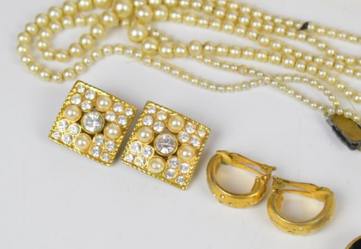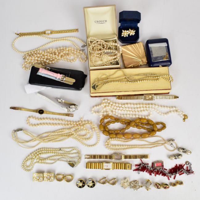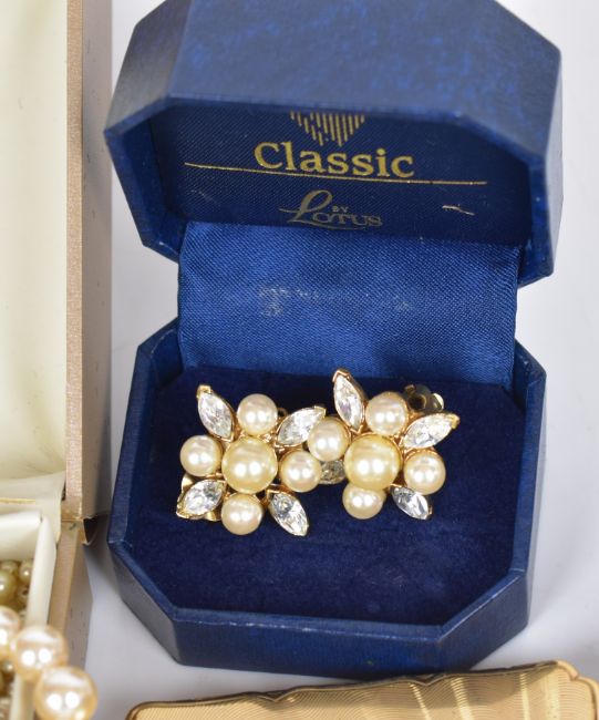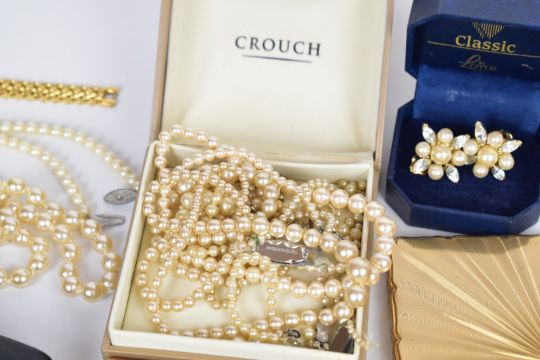 A collection of jewellery including faux pearls, earrings, Stratton compact etc