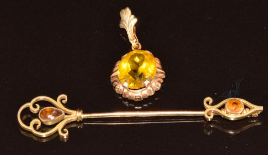 A 9ct gold jabot pin/ pin set with a paste (6.2cm, 2.4g) and a 10k gold pendant set with paste (2.1g, 2.8cm)