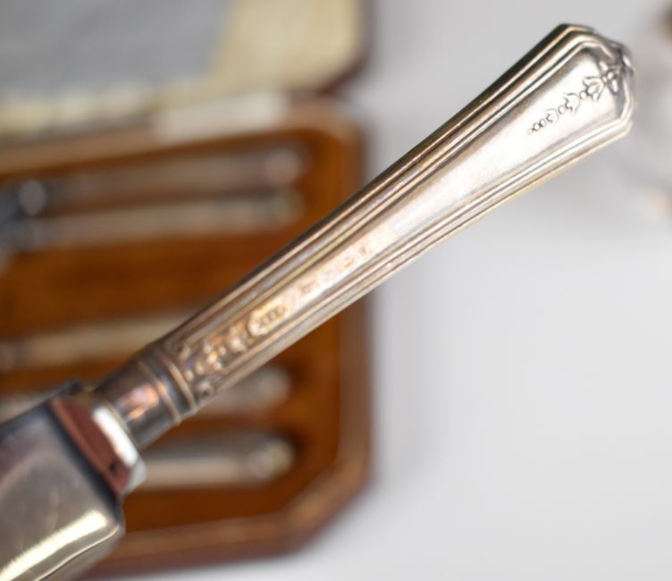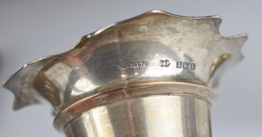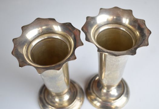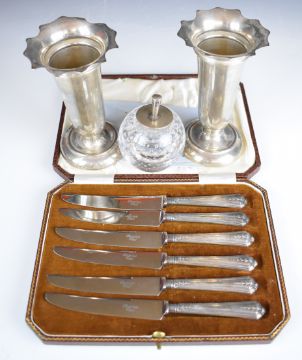 Hallmarked silver mounted items comprising pair of trumpet vases, height 14cm, dressing table brush and cased set of knives