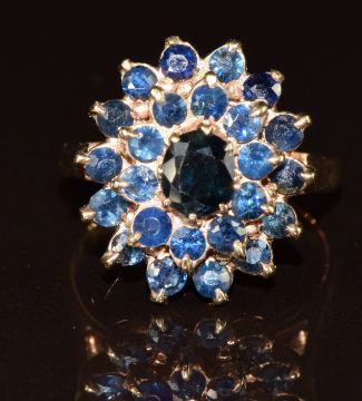 A 9ct gold ring set with a cluster of sapphires, 5.5g, size N