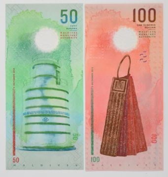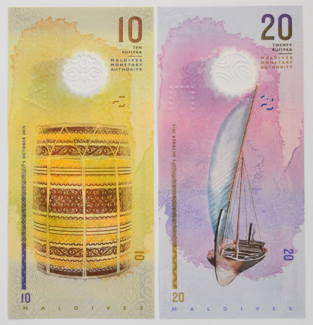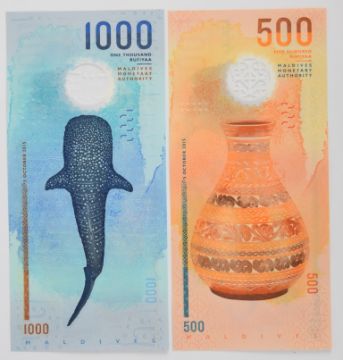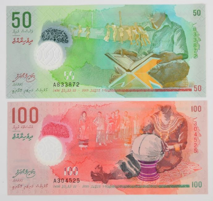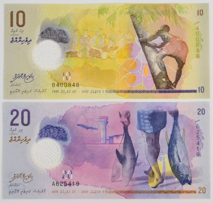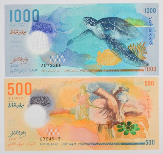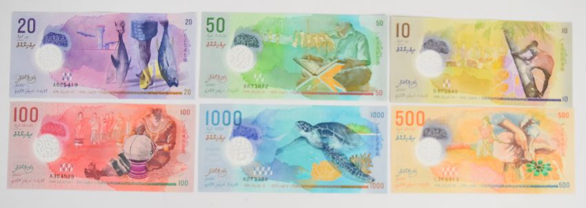 Six Maldives 2015 banknotes comprising 10, 20, 50, 100, 500 and 1000 Rufiyaa