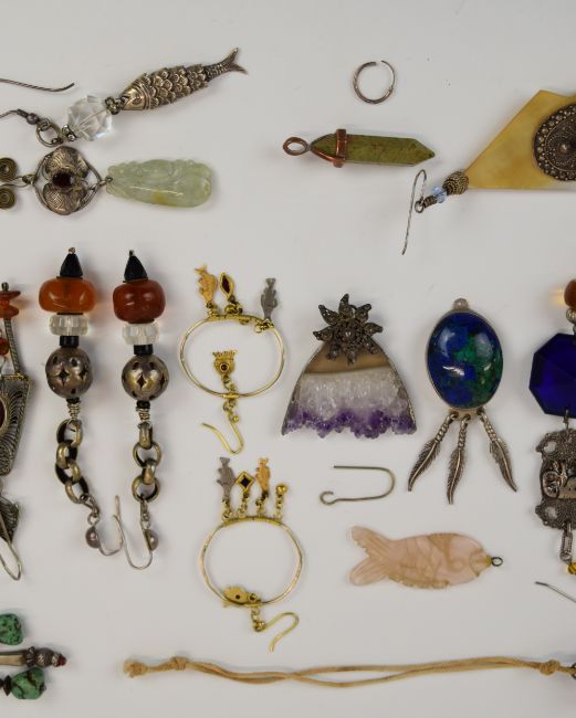 A collection of earrings/ pendants including Tim Guerro silver pendant, silver earrings, mother of pearl earrings, etc
