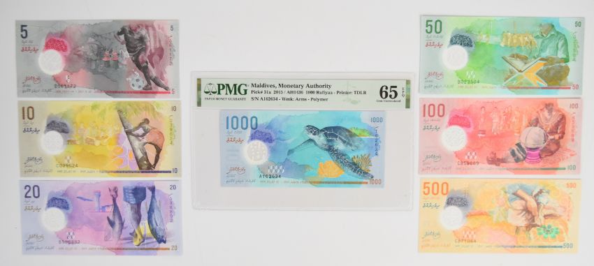 Seven Maldives 2015 banknotes comprising 5, 10, 20, 50, 100 and 500 Rufiyaa and a 1000 Rufiyaa note PMG graded 65 'Gem Uncirculated'