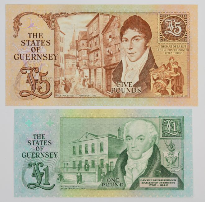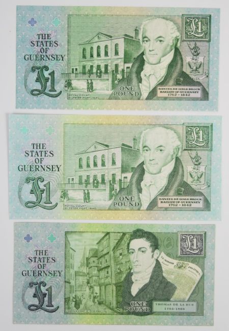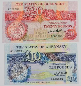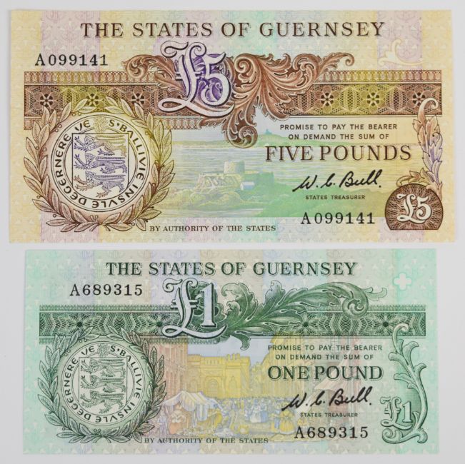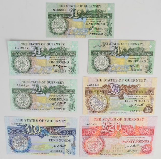 Seven Guernsey 1980-2013 banknotes comprising 1980 Issue 'A' prefix £1, £5, £10 and £20 signed by W.C. Bull, a commemorative £1 note issued in 2013 to commemorate Thomas De La Rue and two other £1 notes (signed M.J. Brown and D.P. Trestain)