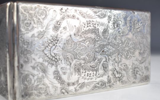 Middle Eastern or similar silver cigarette case with finely engraved decoration of animals including birds amongst foliage, length 14cm, weight 197g