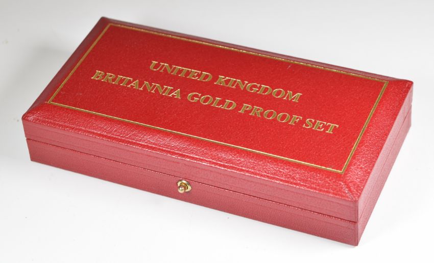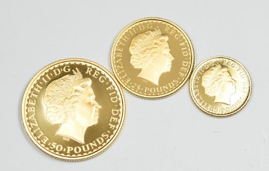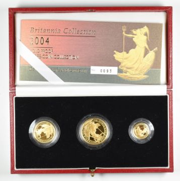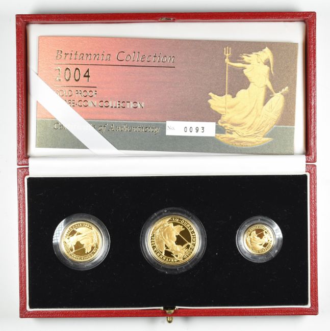 Royal Mint 2004 limited edition (93/1500) Britannia Collection proof three gold coin set comprising £50 (17.02g), £25 (8.51g) and £10 (3.41g), cased with certificate (½, ¼, 1/10 ounce)