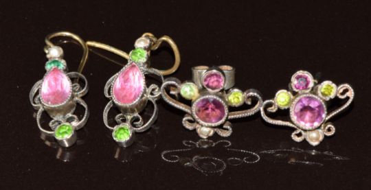 A pair of silver Suffragette earrings set with a seed pearl and purple and green paste, and a similar silver pair set with seed pearls and foiled paste