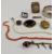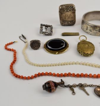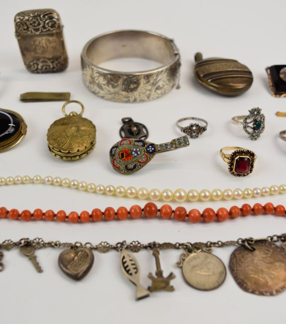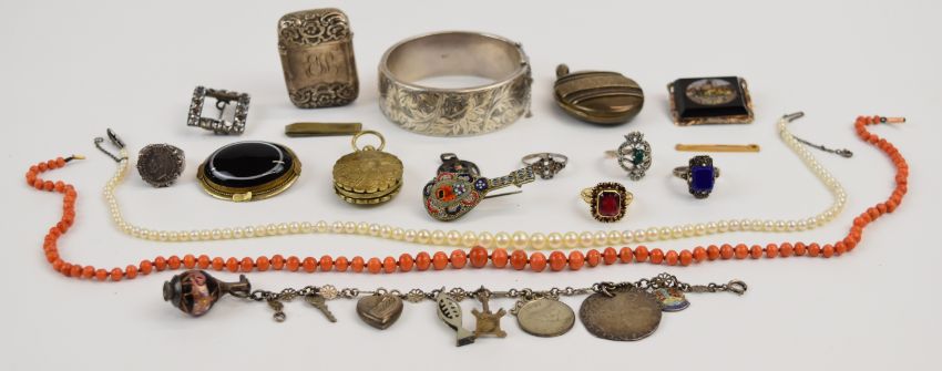 A 10k gold ring set with paste (size P, 3.4g), a 9ct gold brooch (1g), silver bangle, four silver rings, Charles Horner pendant, Victorian silver locket, coral necklace with 9ct gold clasp, foiled paste brooch, two micro mosaic brooches, silver vesta, pearl necklace, silver charm bracelet, etc