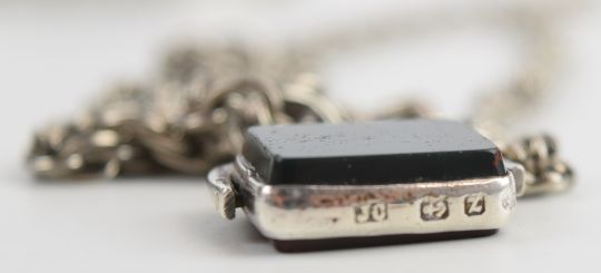 Two hallmarked silver bangles (45g, one Chester 1942), hallmarked silver tea strainer (32g) and a silver swivel fob set with agate, Birmingham 1899