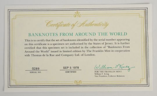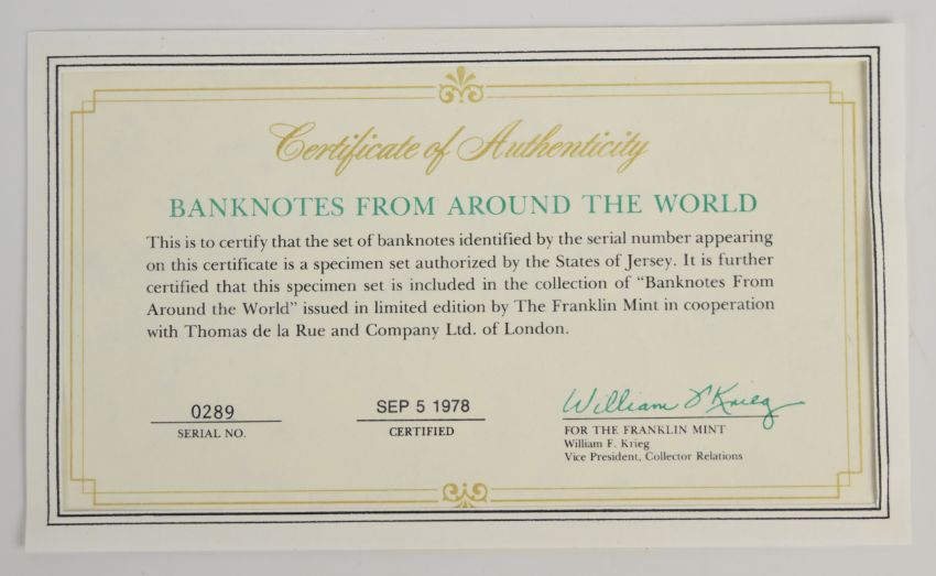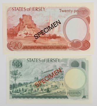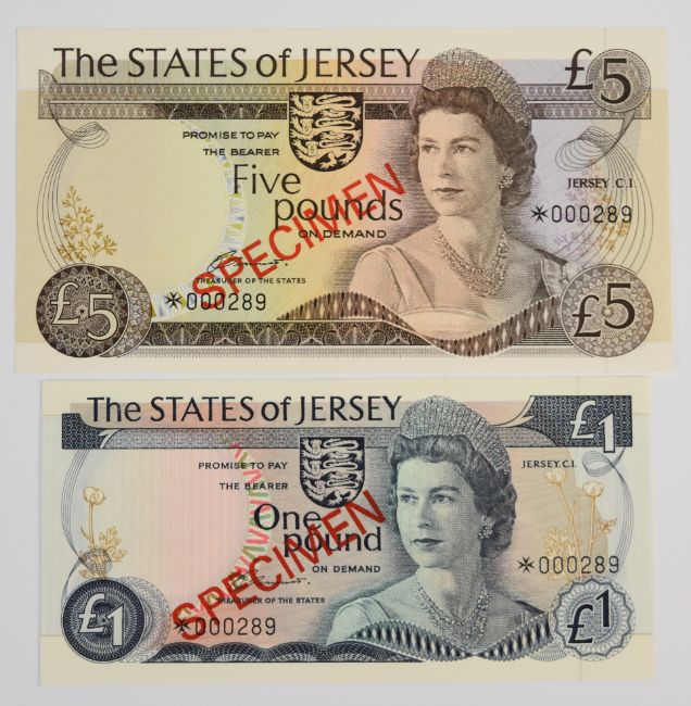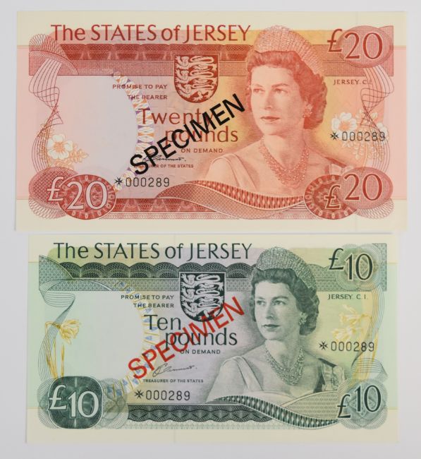 Jersey 1978 SPECIMEN banknote set including £1, £5, £10 and £20, all feature a special Maltese cross serial number prefix and identical (low) serial numbers.