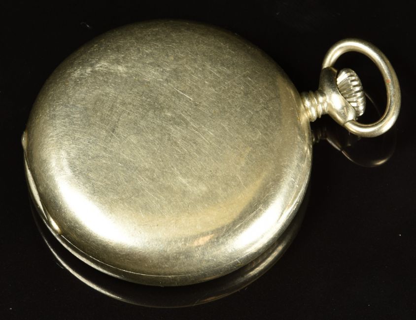 Alpina military style keyless winding open faced chronograph pocket watch with luminous hands and Arabic numerals, black dial signed 'Alpina A Lunser Berlin', nickel plated case and unsigned movement, case diameter 51mm, serial number 499767.