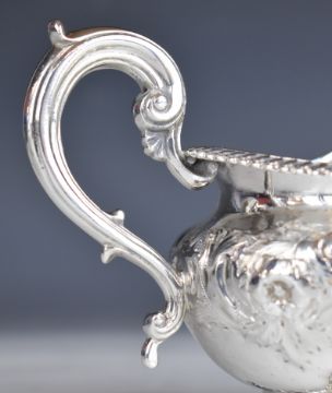 Victorian hallmarked silver sugar bowl and milk jug with embossed floral decoration and gadrooned edges, raised on four feet, London 1819, maker Rebecca Emes & Edward Barnard I, width of sugar bowl 23cm, weight of both 645g