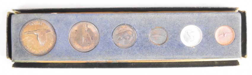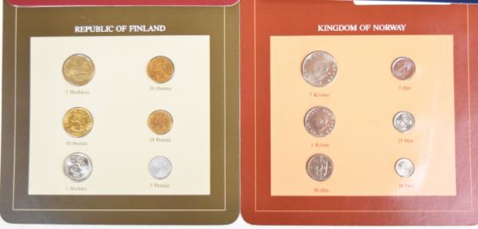 Bird coins of the world, album, each with information about the coin, together with six sheets of coin sets of all nations comprising Iceland, Finland, Czechoslovakia and Norway and a cased set of 1967 Canadian coins from 1 dollar down to one cent, the silver coins being 0.800 silver, weight of silver coins approximately 40g
