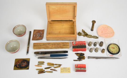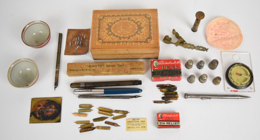 Collection of vintage pens, nibs, compass, trench art seal, silver thimbles, etc including boxed Thomas De La Rue 'Onoto' pen with hallmarked silver clip, Parker pen, dip pens, Japanese pottery saki cups etc.