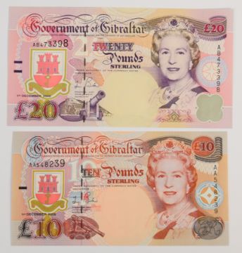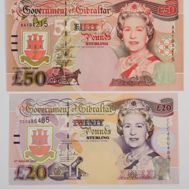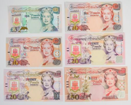 Six Gibraltar 2000-06 banknotes from £5-£50 including a Millennium edition £5, £10 from 2002 and 2006 (which feature different designs on the reverse), £20 commemorating the 300th Anniversary of the Capture of Gibraltar in 1704 and 2006 issue £20 and £50