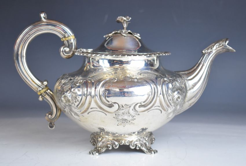 Victorian hallmarked silver teapot with embossed floral decoration, gadrooned edge, ivory insulated handle and flower finial, raised on four feet, London 1837, maker Samuel Hayne & Dudley Cater, length 29cm, weight 763g all in, with ivory licence