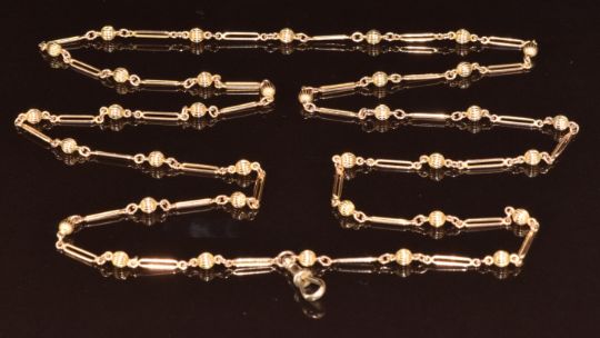 A c1920 9ct gold guard chain made up of ridged spherical beads and elongated links, 14g, 84cm
