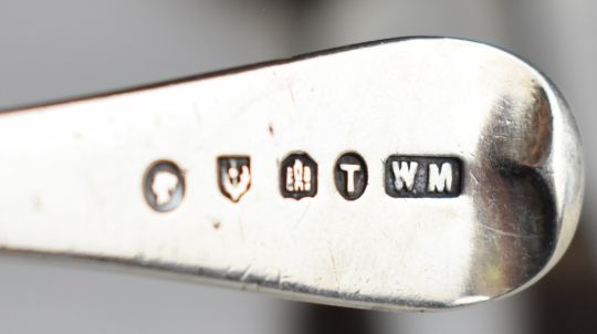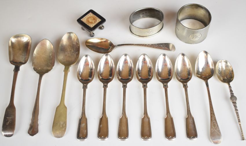 Victorian and later hallmarked silver spoons including an anointing spoon, two hallmarked silver napkin rings, stamp case marked 925 and a set of six fiddle and thread pattern silver plated spoons, weight excluding stamp case and plated spoons 195g