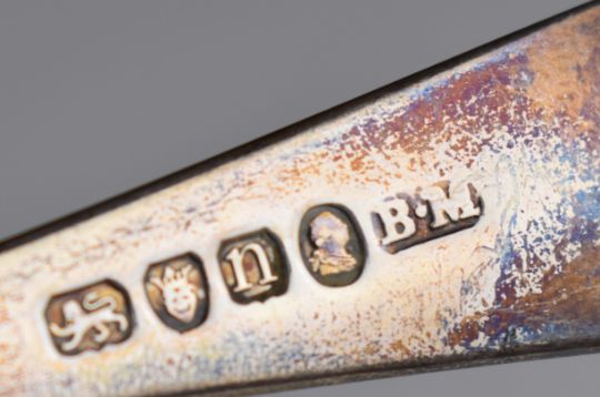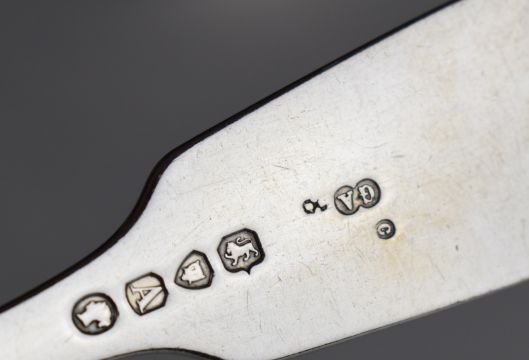 Georgian and later hallmarked silver cutlery comprising fiddle pattern table fork and two ladles, one Edinburgh 1811, maker Mitchell & Russell, length of longest 21cm, weight of all three 151g