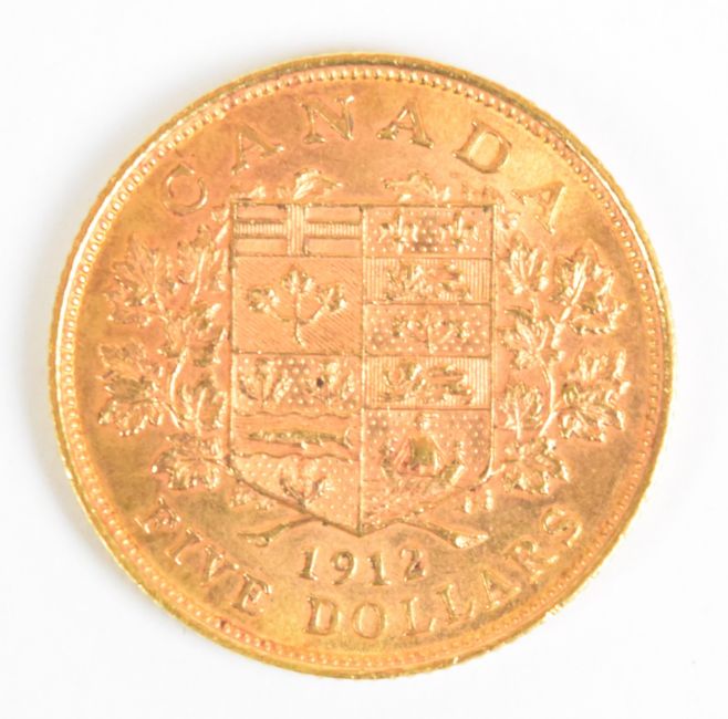 1912 George V Canadian $5 coin, 8.36g, 0.900 gold