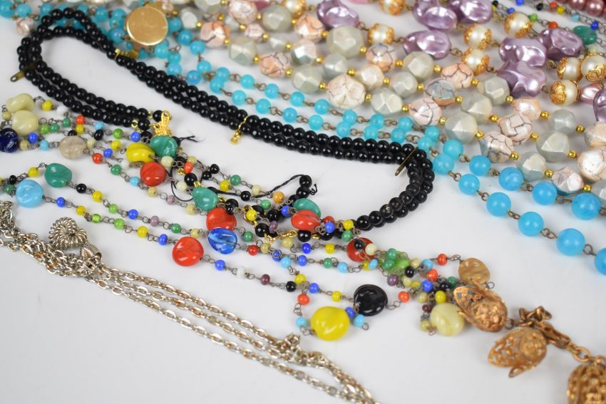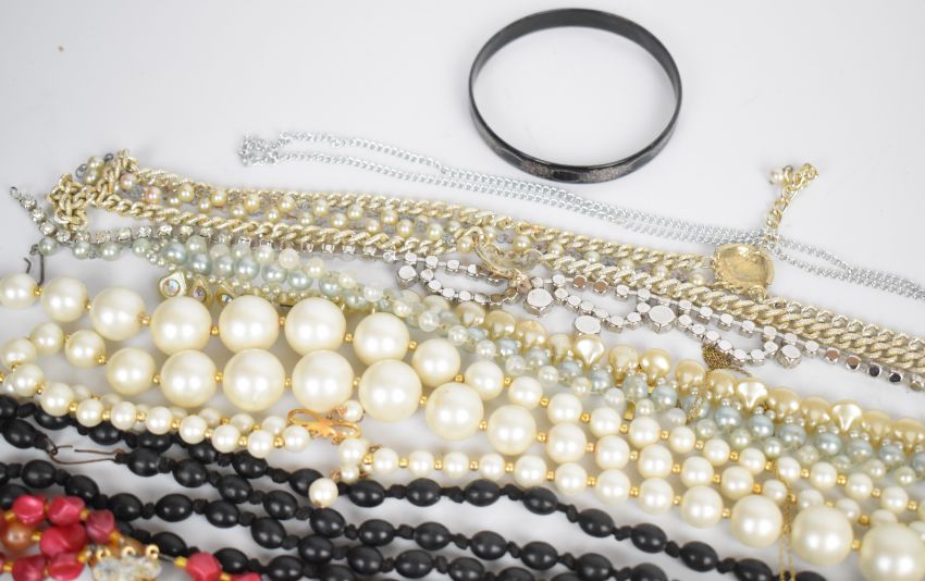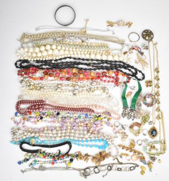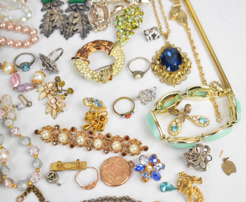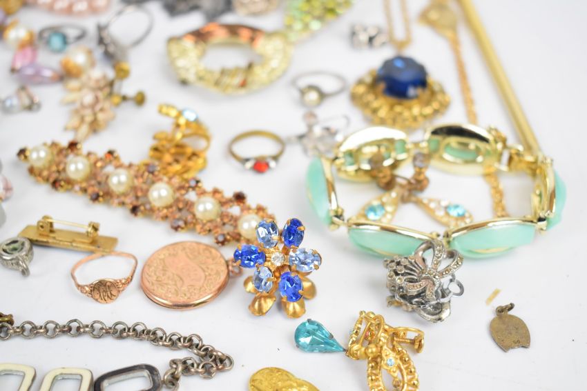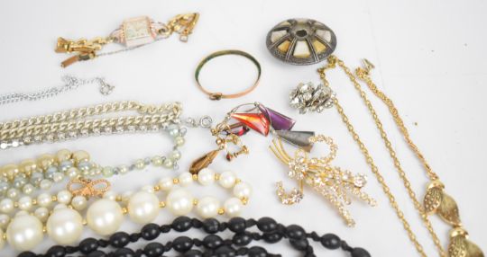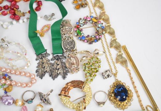 A collection of jewellery including gilt cufflinks, 9ct gold back and front locket with scrolling decoration, two silver rings set with marcasite, silver brooch in the form of a four leaf clover set with paste, beads, Thomas Sabo charm, vintage brooches, Jewelcraft bracelet, Michaela Frey bangle, etc