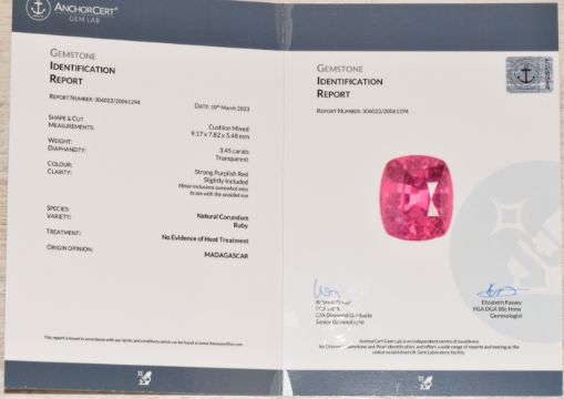 A loose natural untreated cushion mixed cut ruby of approximately 3.45ct, with AnchorCert certificate and valuation from Martin & Co, Cheltenham