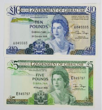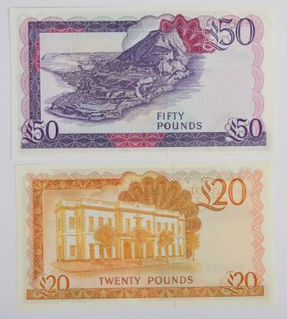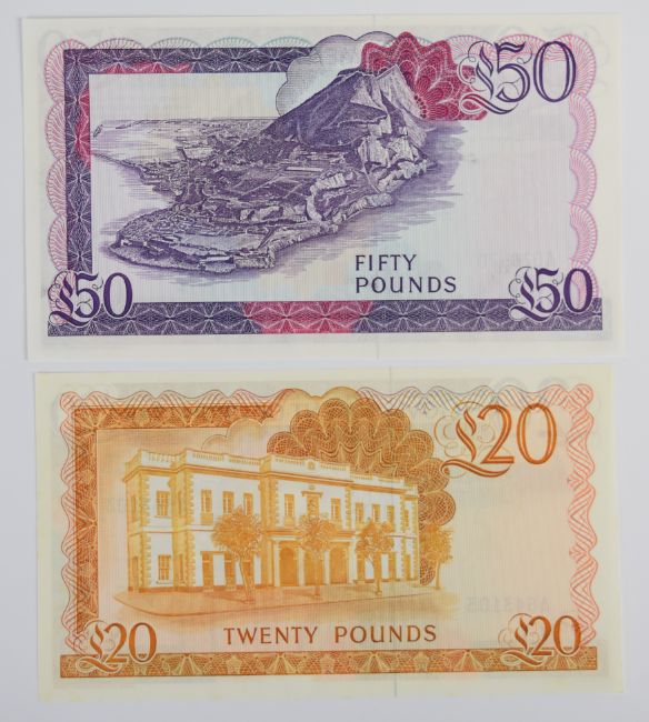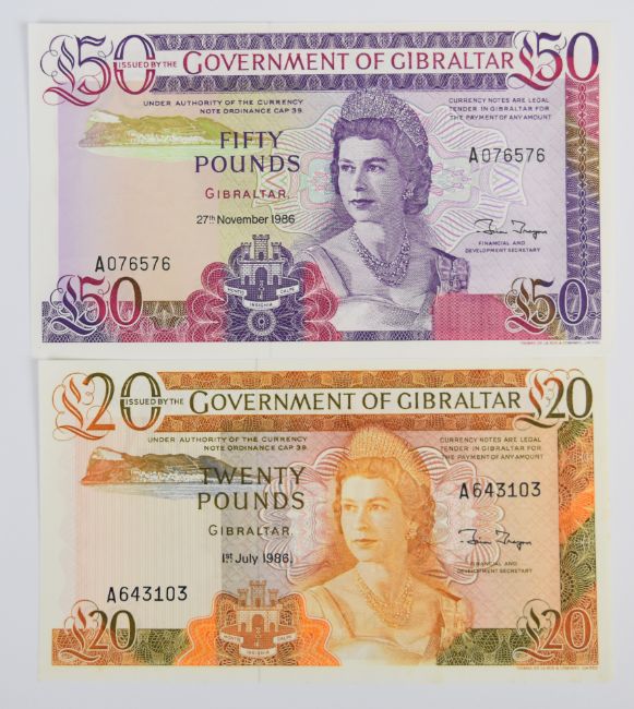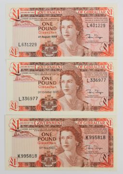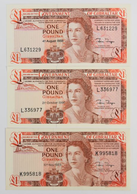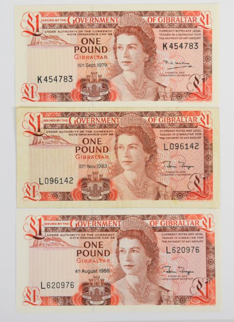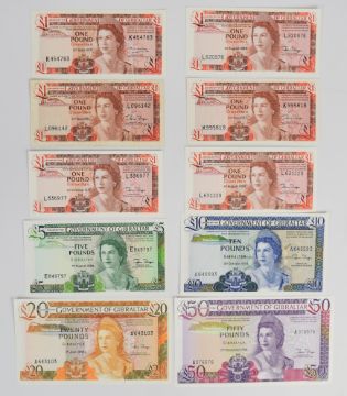 Nine Gibraltar 1979-88 banknotes including £1, £5, £10, £20 and £50 and a high-grade 1979 £1