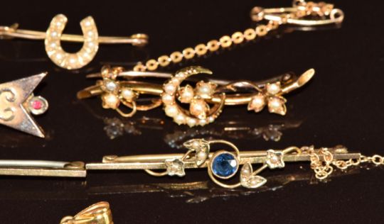 Five Edwardian 9ct gold brooches including two in the form of horseshoes set with seed pearls, one in the form of a crescent set with seed pearls, etc (12.5g) and a 9ct gold Edwardian pendant (1.8g)