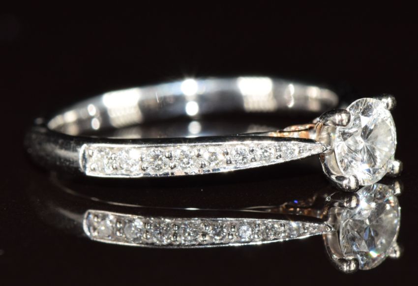 An 18ct white gold ring set with a 0.42ct round brilliant cut diamond and further diamonds to the shoulders, with original Beaverbrooks receipt for £3,400 and certificate stating colour- G, clarity-VVS2, 2.9g, size K