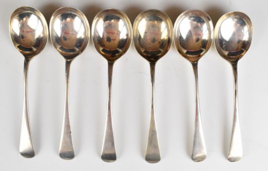 Set of six George V hallmarked silver Old English pattern soup spoons, Sheffield 1920, maker Cooper Brothers & Sons Ltd, length 19cm, weight 406g