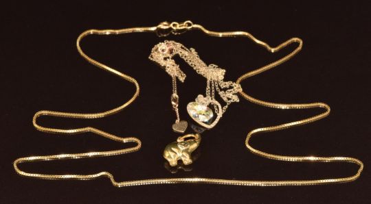 A 14k gold chain (3.1g) two 9ct gold chains, two heart pendants and a 9ct gold elephant charm (2g)