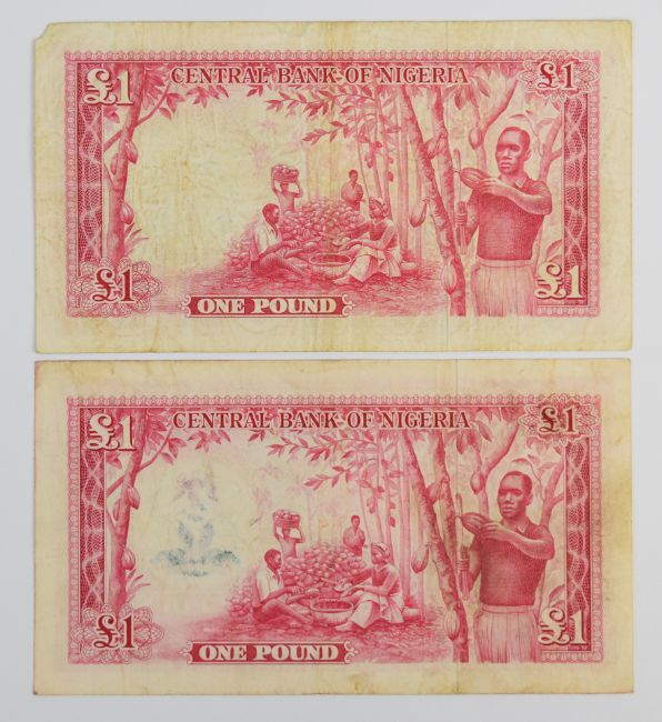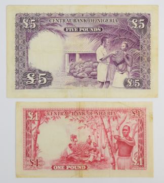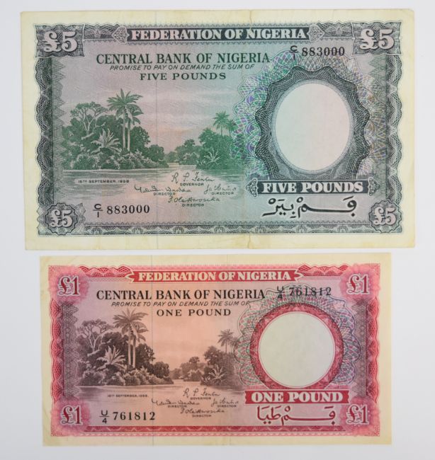 Six Federation of Nigeria 1958 banknotes comprising 5 Shillings, 10 Shillings, three £1 notes and £5. Curiously, one of the £1 notes has been overprinted with the Nigerian coat of arms. Close inspection reveals the motto 'Unity and Faith, Peace and Progress', introduced in 1978.