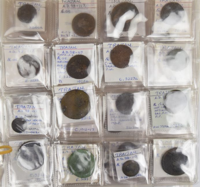 A small collection of coins including Roman / Roman style coins, some with annotations, Jubilee Mint silver proof £1, two £5 coins, approximately 29g of pre 1920 silver and approximately 106g of pre 1947 silver