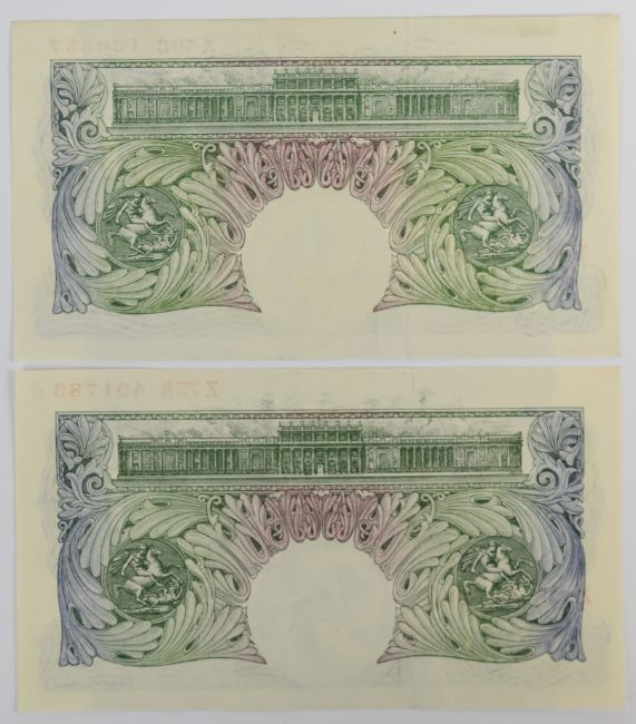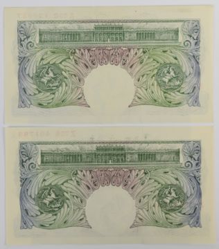 Four Bank of England P.S. Beale 10 Shillings, £1 and £5 banknotes including white £5, London, 19th March 1952