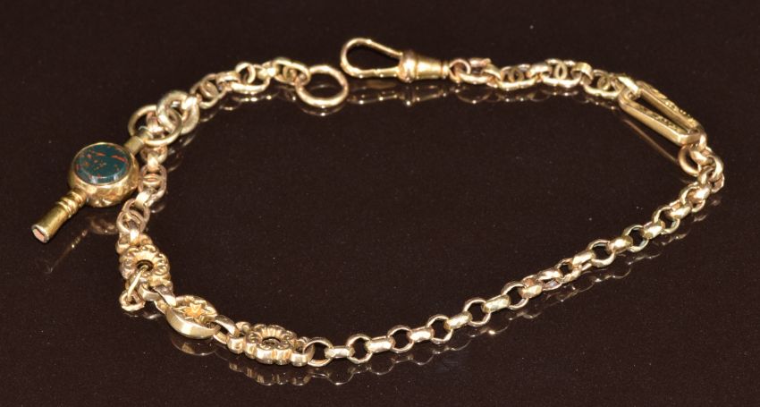 A 9ct gold bracelet made from a fob watch chain, with Victorian watch key