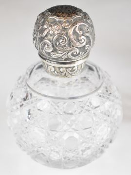 Eight Victorian and later hallmarked silver topped dressing table scent bottles including a hobnail cut example with embossed screw lid, London 1887, maker's mark indistinct but appears to be EH, height 12.5cm