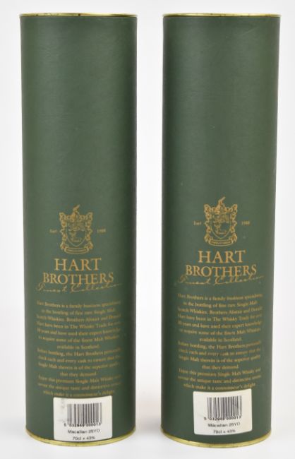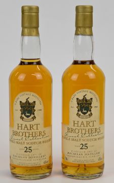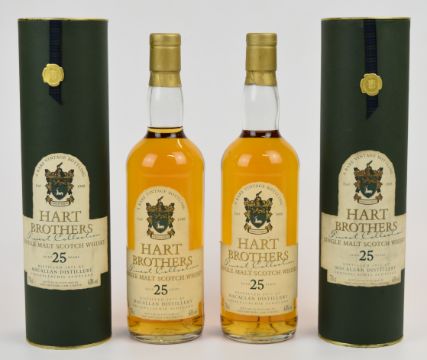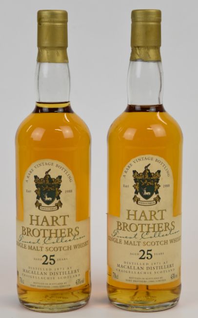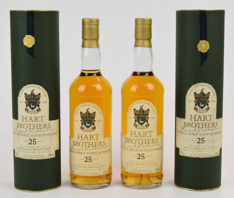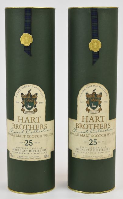 The Macallan distillery 'Hart Brothers Finest Collection' 25 year old Single Malt Scotch Whisky, 1971, 43% vol, 70cl, in original presentation tubes. PLEASE NOTE ALL ALCOHOL & TOBACCO ITEMS ARE SUBJECT TO OVER 18 CHECK ON COLLECTION OR DELIVERY