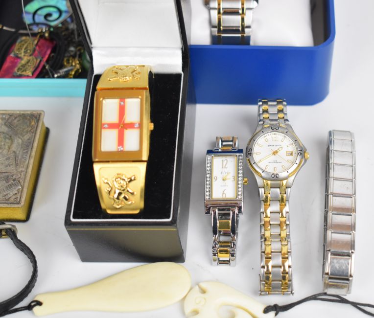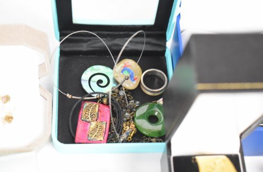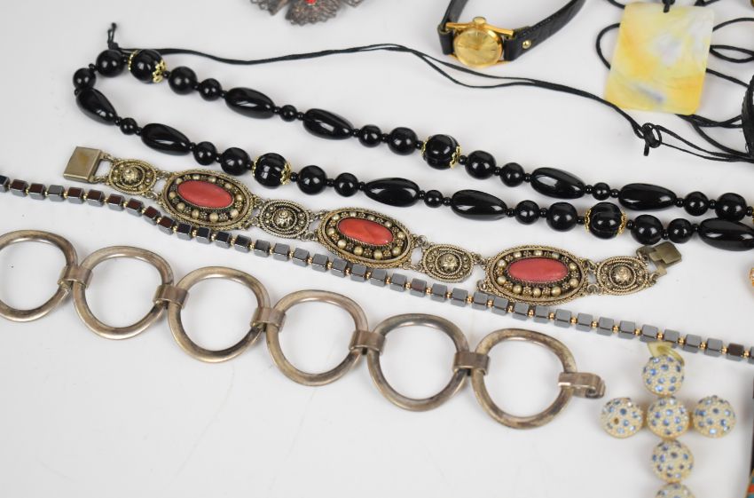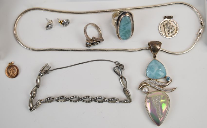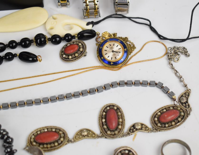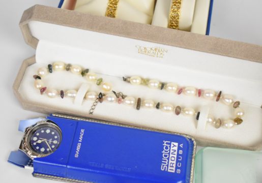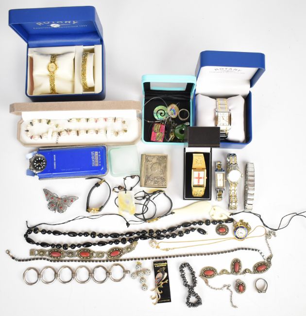 A collection of jewellery including white metal suite of jewellery, silver bracelet, Rotary watches, silver rings, pearl necklace, Swatch, Pandora earrings, silver ring and matching pendant, etc
