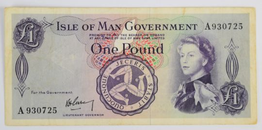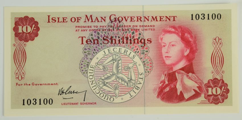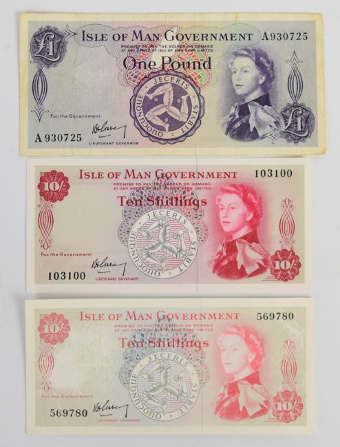 Three Isle of Man 1961 Issue 10 Shillings and £1 banknotes, signed R.H. Garvey