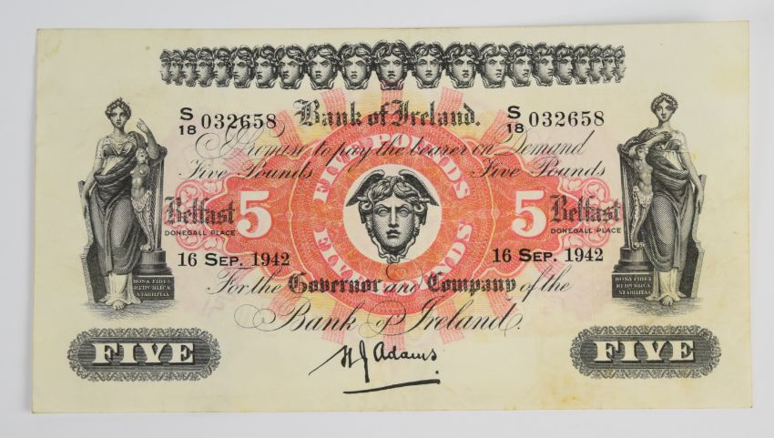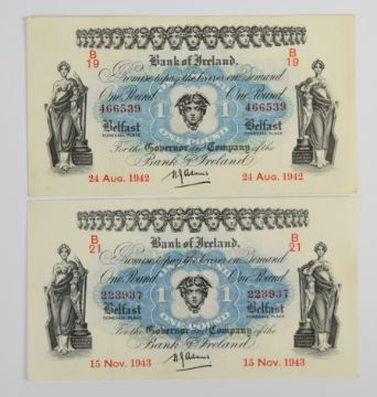 Five Northern Ireland Bank of Ireland (Belfast) 1942-43 banknotes including all denominations from £1 to £10, all signed by H.J. Adams