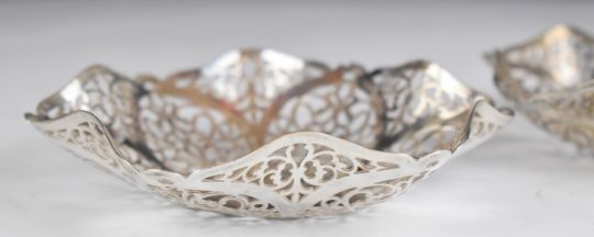 Pair of George V hallmarked silver bon bon dishes with pierced and crimped rims, Birmingham 1931, maker S J Levi & Co, diameter 14.5cm, weight 186g